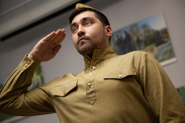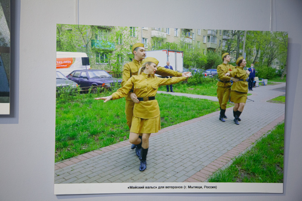 Актёр нашего театра Егор Краснов в паре с руководителем «Ансамбля барабанщиц» Анной Поченикиной для собравшихся станцевали «Вальс победы». Тот самый, который танцевали во дворах Мытищ в преддверии 9 мая для ветеранов. Несколько снимков с весенней акции, кстати, присутствуют на экспозиции.
