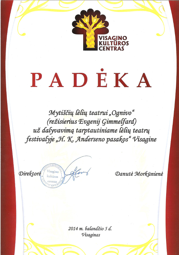 С 1 по 9 апреля Мытищинский театр кукол «Огниво», при поддержке Администрации Мытищинского муниципального района, принимал участие в Международном фестивале театров кукол «Сказки Ханса Кристиана Андерсена» в городе-побратиме Паневежисе. Фестиваль состоялся в рамках проекта «ПАНЕВЕЖИС - КУЛЬТУРНАЯ СТОЛИЦА ЛИТВЫ. ПЕРЕСЕЧЕНИЕ КУЛЬТУР»