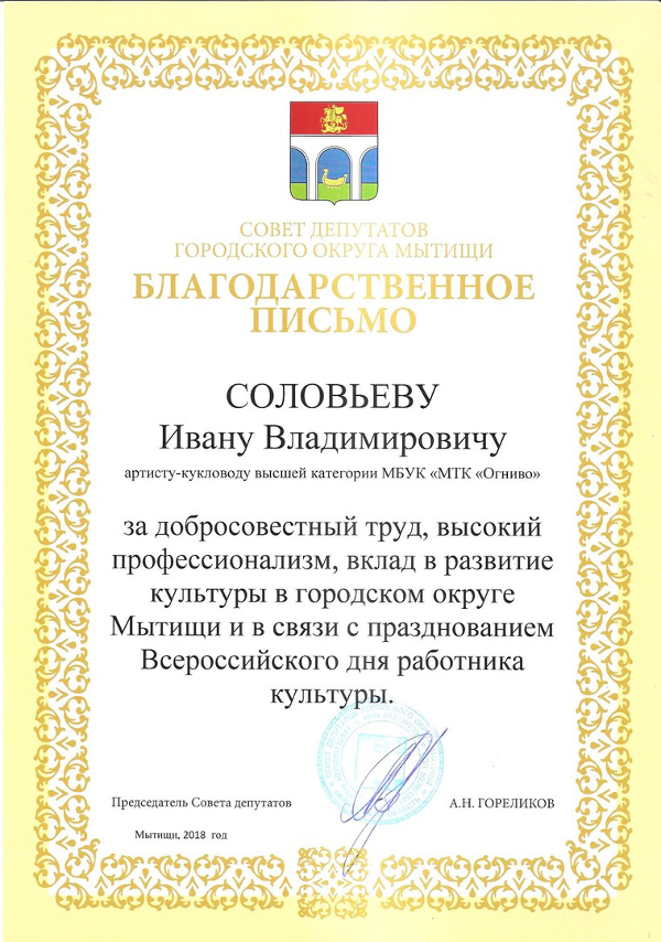 В этом году за добросовестный труд, высокий профессионализм и вклад в развитие культуры в городском округе Мытищи и в связи с празднованием Всероссийского Дня работника культуры от театра кукол «Огниво» были награждены: артист-кукловод высшей категории
