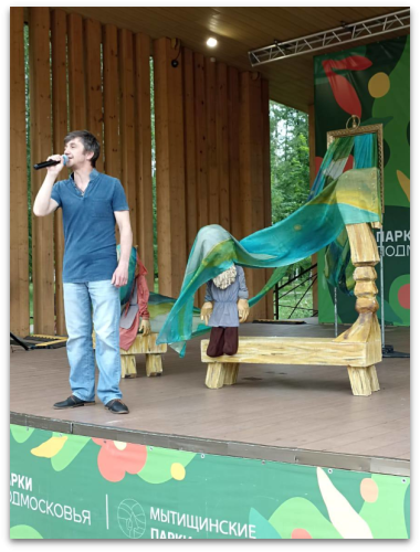 Переместившись на сцену амфитеатра парка, в лёгкой игровой форме артисты вовлекли детей в театральный процесс и они стали исполнителями ролей в спектакле театра "Сказка о рыбаке и рыбке".