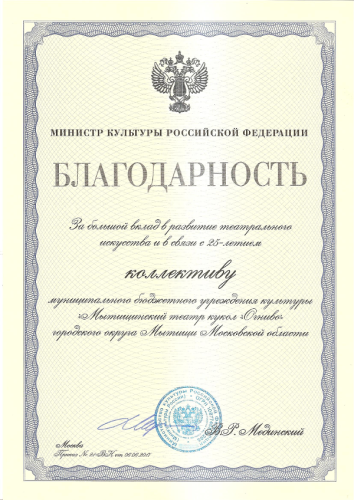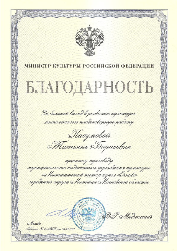 В преддверии открытия 26 театрального сезона театру «Огниво» была объявлена Благодарность Министра культуры Российской Федерации за большой вклад в развитие театрального искусства и в связи с 25-летием со дня основания. Заслуженной артистке Московской области Татьяне Касумовой объявлена Благодарность Министра культуры Российской Федерации за большой вклад в развитие культуры и многолетнюю плодотворную работу.