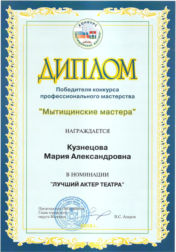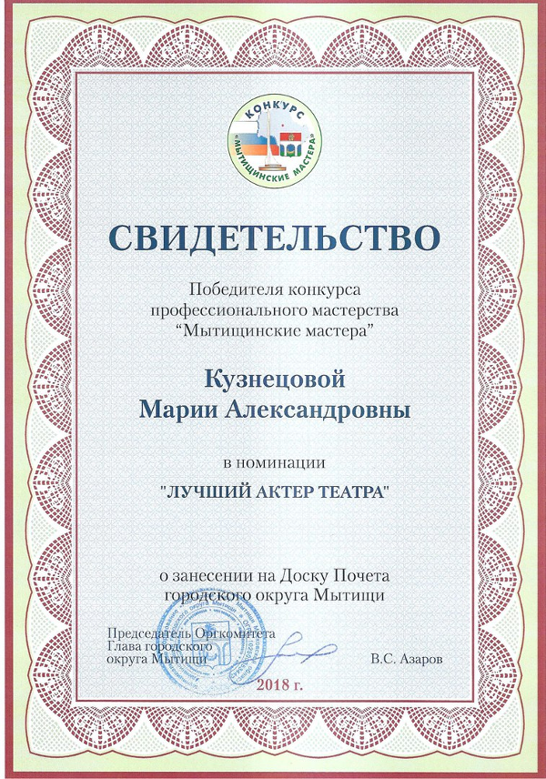 Поздравляем актрису нашего театра Марию Кузнецову с победой в конкурсе профессионального мастерства «Мытищинские мастера» в номинации «Лучший актёр театра» с занесением на Доску Почёта городского округа Мытищи.