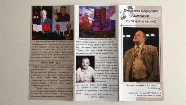 Театр кукол «Огниво» им. С. Железкина поздравляет ученицу Средней общеобразовательной школы № 14 городского округа Мытищи Полину Силуянову с третьим местом в областном этапе Всероссийского конкурса краеведческих исследовательских работ «Отечество» в номинации «Культурное наследие».