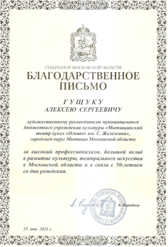 На днях он получил Благодарственное письмо губернатора Московской области Андрея Воробьева «за высокий профессионализм, большой вклад в развитие культуры, театрального искусства в Московской области и в связи с 50-летием со дня рождения».