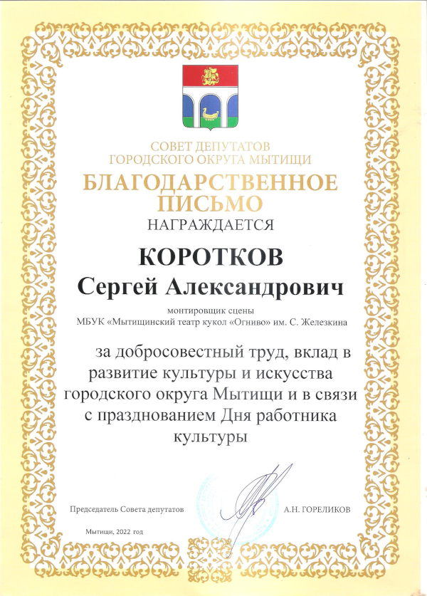 Монтировщику сцены театра Сергею Короткову было вручено Благодарственное письмо Совета депутатов городского округа Мытищи.