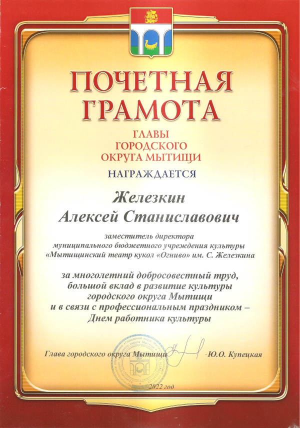 За добросовестный труд, большой вклад в развитие культуры городского округа Мытищи заместитель директора театра Алексей Железкин был отмечен Почётной грамотой Главы городского округа Мытищи.