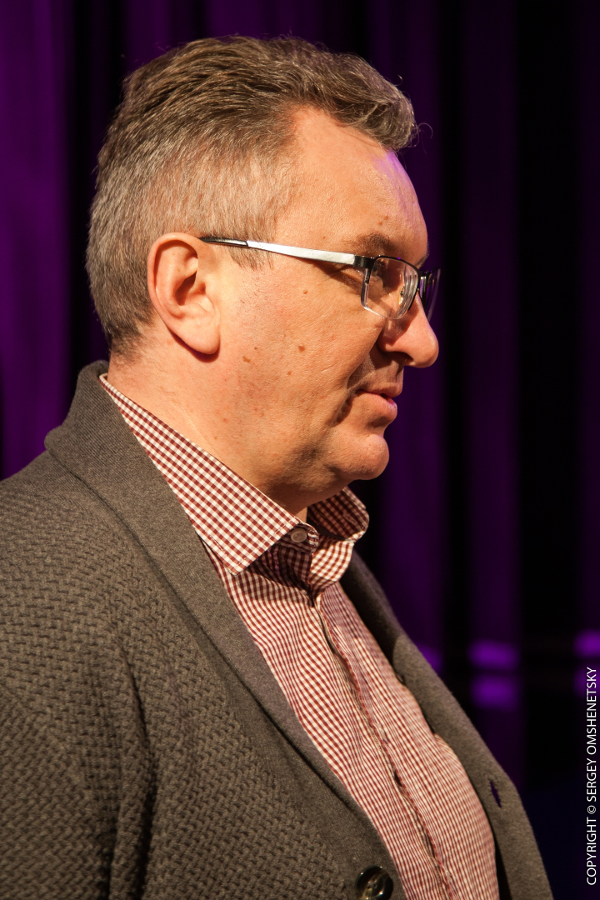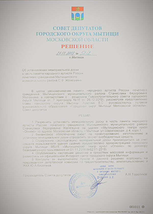 Участие в собрание так же принял председатель Совета депутатов городского округа Мытищи Андрей Гореликов. Помимо поздравительных слов в адрес мужской половины театра, он торжественно вручил коллективу решение Совета об установлении мемориальной доски в честь памяти народного артиста России, почётного гражданина Мытищинского муниципального района С. Ф. Железкина.
