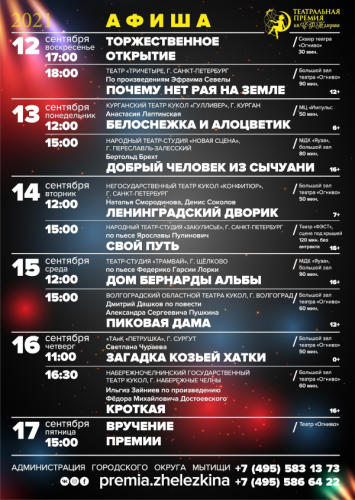 Торжественное открытие премии состоится 12 сентября в 17:00. Ждём зрителей в сквере театра – будет грандиозно! А имена победителей мы узнаем уже 17 сентября. Но прежде – просмотр спектаклей…
