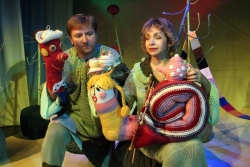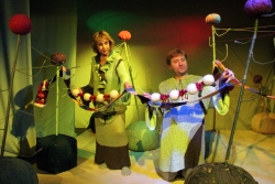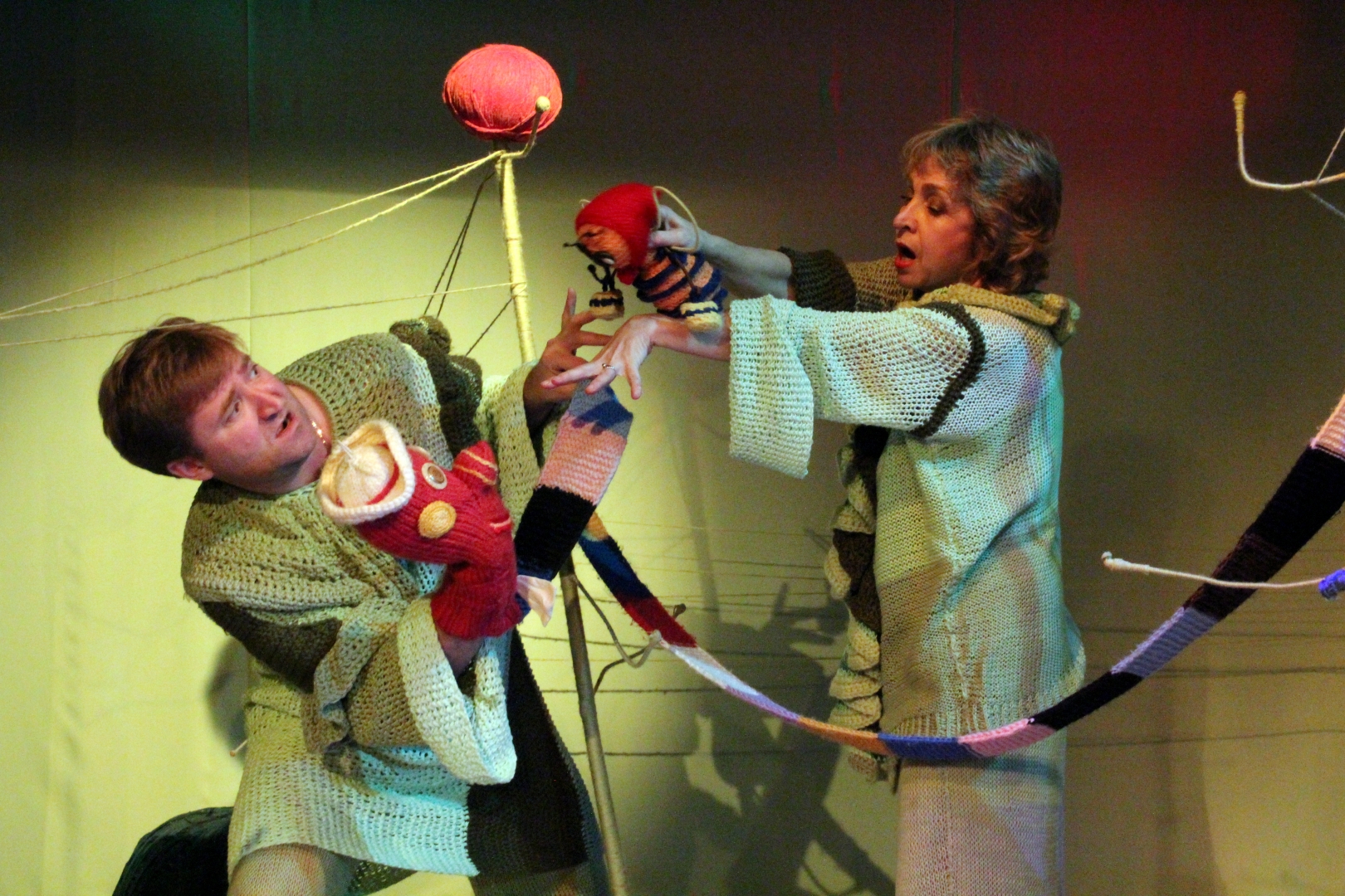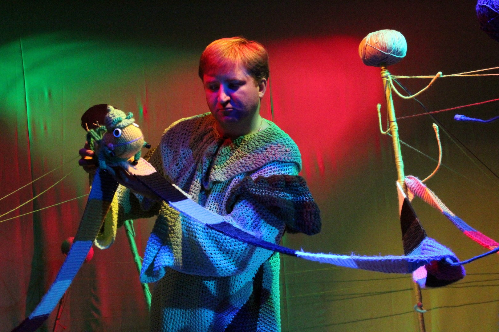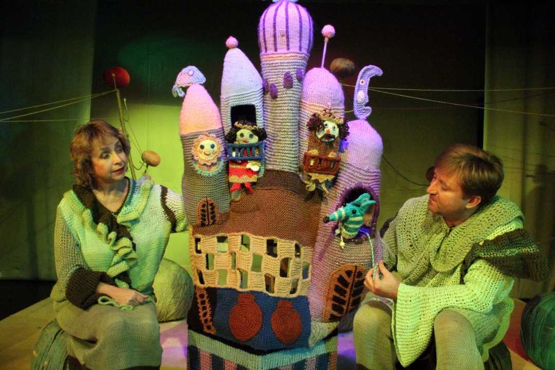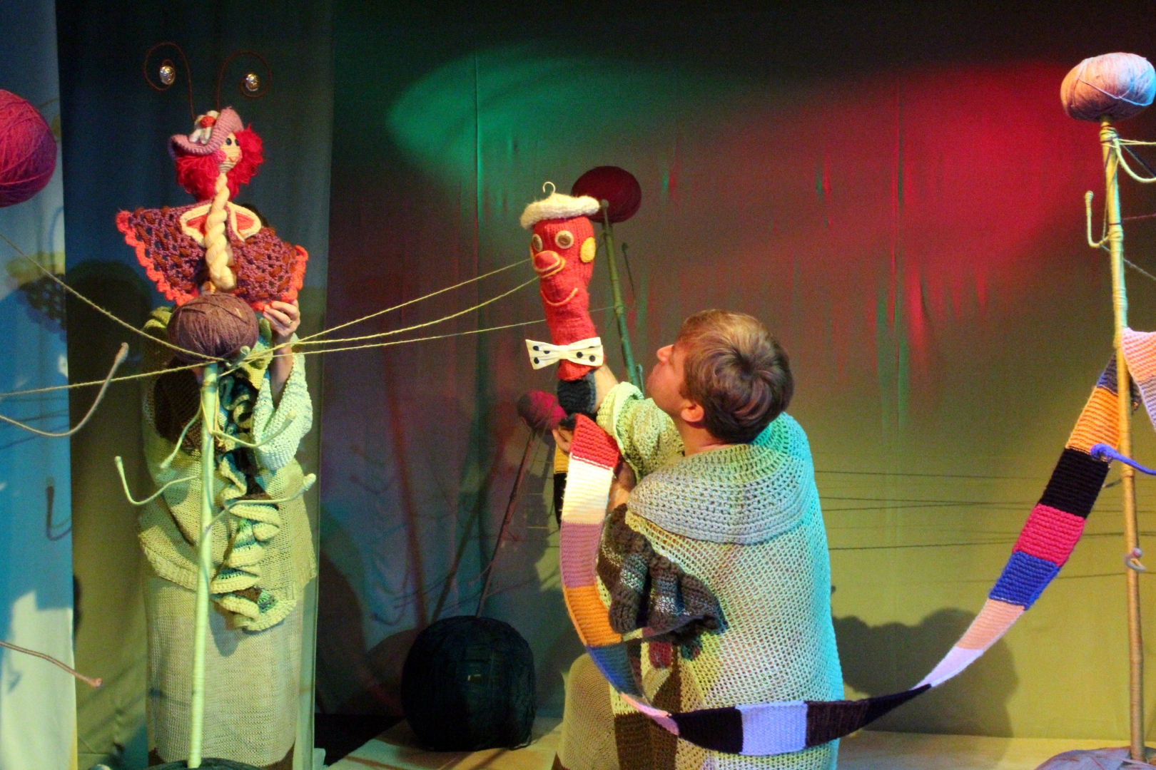 Все куклы в спектакле - вязаные, тёплые, уютные, как будто сделанные руками родной бабушки. Рассказывая сказку внучатам, она разматывает клубок и вяжет, и куклы превращаются в героев сказки.